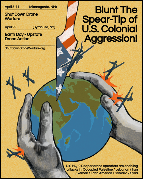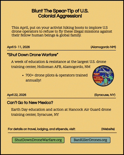 April 5-11, 2026: Shut Down Drone Warfare – A week of education & resistance at the largest U.S. drone training center, Holloman AFB, Alamogordo, NM. The week's schedule HERE, includes film screenings of National Bird & Abby Martin’s Earth’s Greatest Enemy, Daily Yoga after morning vigils, Alamogordo Peace Party, New Mexico musicians Paul Pino & friends and others, Rally & March in Downtown Alamogordo, Day of Nonviolent Resistance, and, most importantly, daily am & pm vigils at Holloman Killer Drone Training Base, to educate and foster GI Resistance. More info: view flyers below or visit ShutDownDroneWarfare.org & BanKillerDrones.org