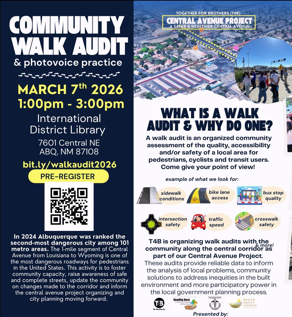 Join Together for Brothers as we come together to demand safer streets along Central Avenue. Our community continues to feel the impact of traffic violence. According to Smart Growth America’s Dangerous by Design report, Albuquerque ranks the most dangerous one mile stretch for pedestrians between Louisiana & Wyoming. Meet us Saturday March 7, 1-3pm at the International District Library, 7601 Central NE, for a Community Walk Audit. It’s about action, it’s about slowing traffic. It’s about protecting our families, elders, and transit riders. It’s about listening to the people who live, work, play, pray, and learn in the International District.