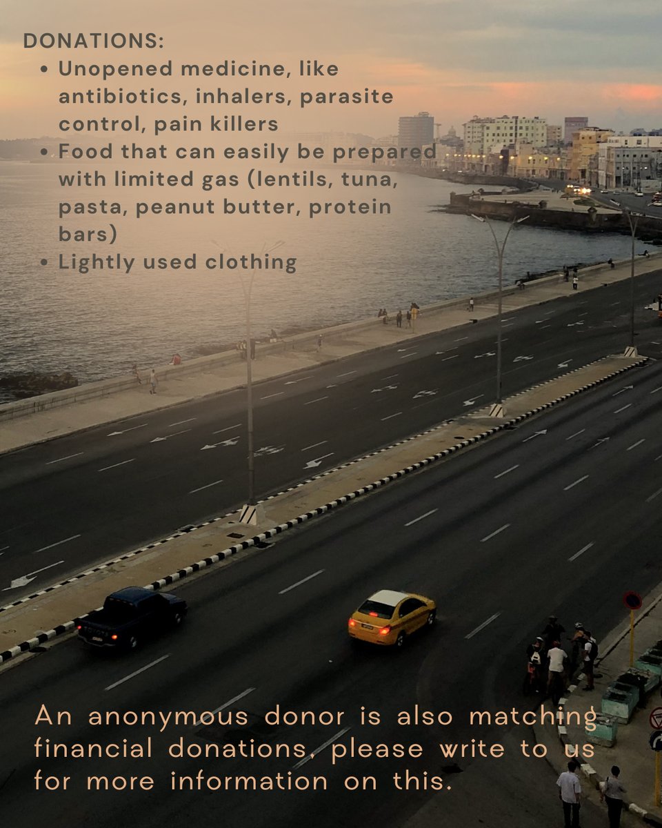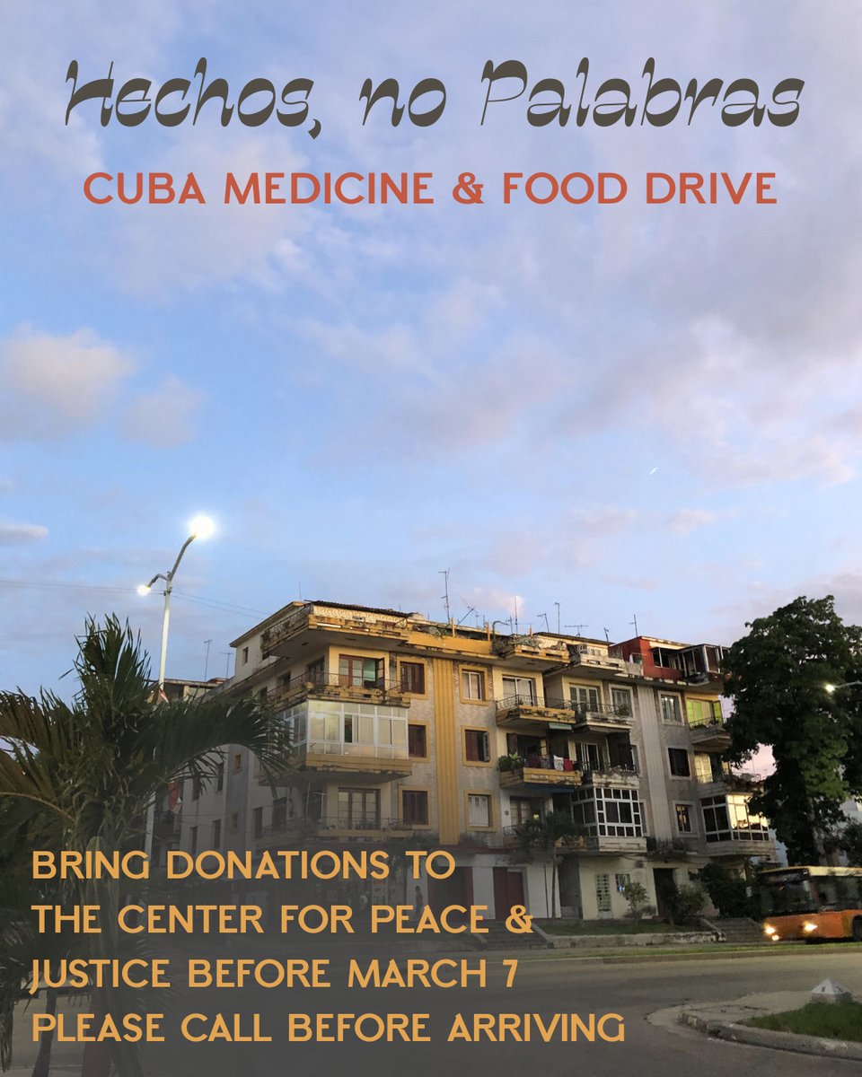 One of our CC members will be traveling to Havana very soon, and we are taking the opportunity to collect food and medicine for Cubans who are facing worsening conditions under the current administration. In particular we are asking that if you have access to any unopened medicine, food and household items that you would consider donating. Unopened medicine, like vitamins, inhalers, antibiotics, and parasite control would be helpful. Cuba is rationing gas, so please give pantry items that are easily available from a can or easily rehydrated with minimal gas, like lentils, tuna, pasta, peanut butter. If you have any lightly used clothes or shoes (not jackets or heavy coats), we will accept this as well.