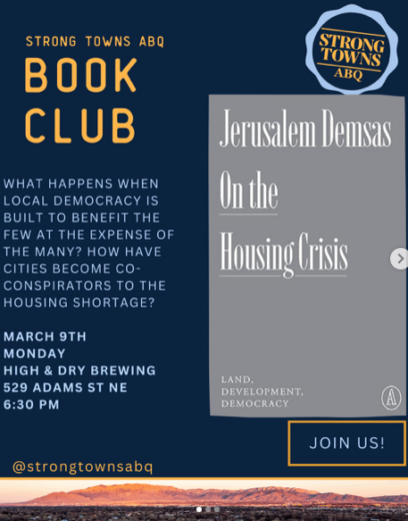 Monday, March 9, 6:30pm: Strong Towns ABQ Book Club at High & Dry Brewing, 529 Adams St NE.— This month, we’re reading On the Housing Crisis by Jerusalem Demsas. What happens when local democracy is shaped to benefit the few at the expense of the many? How did well-intentioned civic processes become tools that deepen the housing shortage? Join us for a relaxed, thoughtful conversation about land use, housing, and how cities like Albuquerque got here—and where we might go next. All are welcome. You don’t need to finish the book to join the conversation.