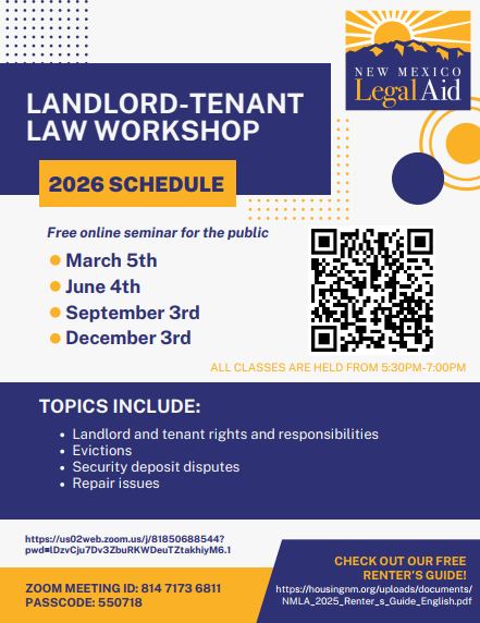 March 5, 5:30pm: NM Legal Aid’s online Landlord-Tenant Law Workshop, see flyer below for details