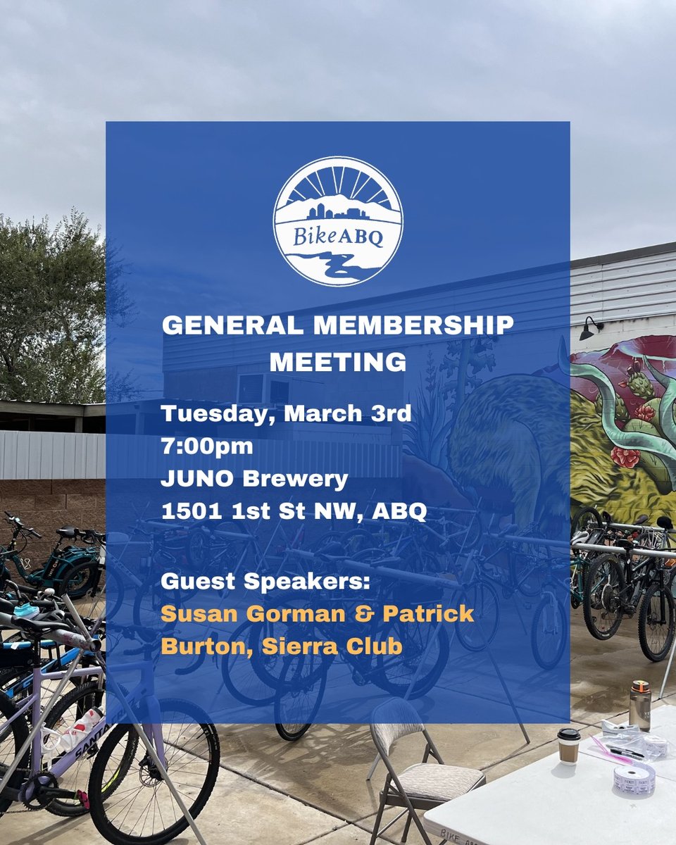 Tuesday, March 3, 7pm: BikeABQ General Membership Meeting at JUNO (1501 1st St NW), with guest speakers Susan Gorman and Patrick Burton of the Sierra Club: Rio Grande Chapter sharing insights and connect on advocacy efforts. We’ll also provide updates on what BikeABQ is working on to make biking in Albuquerque safe and accessible for people of all ages and abilities.