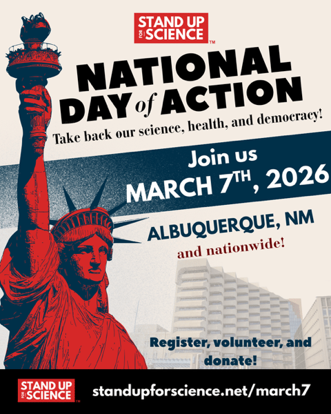 Saturday, March 7, Noon-2pm: National Standup for Science Day Demonstration at Albuquerque Civic Plaza. We come together in response to the Trump Administration's dismantling of our nation's premier science institutions and escalating threats to the lives and livelihoods of Americans. We recognized these attacks for what they are: authoritarian powergrabs. We believe that science is the lifeblood of American democracy and freedom. With a bold strategy combining activism, messaging campaigns, grassroots organizing, and political advocacy, we’re mobilizing the fight for science and democracy, now and for generations to come.