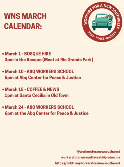 Albuquerque Workers School is a political education class facilitated by Workers for a New Southwest, reading and discussing fundamental Marxist theory. Meetings are Tuesday, March 10 & 24, 6-8pm in the front office at the Peace Center. workersforanewsouthwest@proton.me.