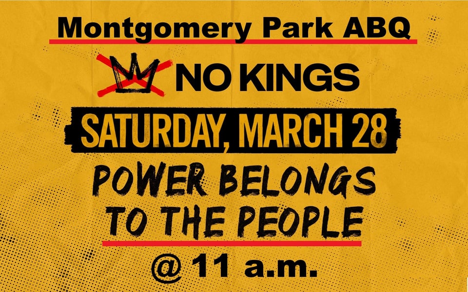 Saturday, March 28, 11am-3pm: No Kings protest at Montgomery Park, 5301-5499 Ponderosa Ave NE. mobilize.us/mobilize/event/894473