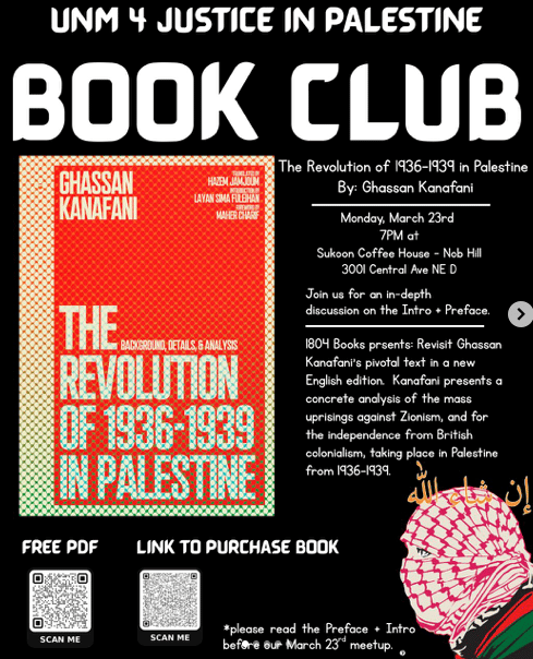 Monday March 23, 7pm: UNM for Justice in Palestine book club meets at Sukoon Coffee House, 3001 Central Ave NE, in their meeting room towards the back of the cafe to discuss The Revolution of 1936-1939 in Palestine: Background, Details, and Analysis by Ghassan Kanafani. We discuss two chapters at a time, this meeting being the book’s Intro + Preface. Please email sailor7mercury@proton.me to request a printed copy of the pdf.