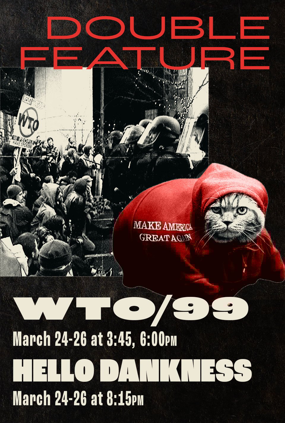 Tuesday-Thursday, March 24-26: End of America Double Feature at Guild Cinema, 3405 Central Ave NE. See one or both for the same price! WTO/99 (Dir. Ian Bell, 2026, 102m) at 3:45pm & 6pm, documenting the watershed moment that was the Seattle WTO protests. Trailer HERE. Followed by Hello Dankness (dir. Soda Jerk, 2022, 70m) at 8:15pm, an epic video mashup satirizing the 2016 election cycle. Trailer HERE.