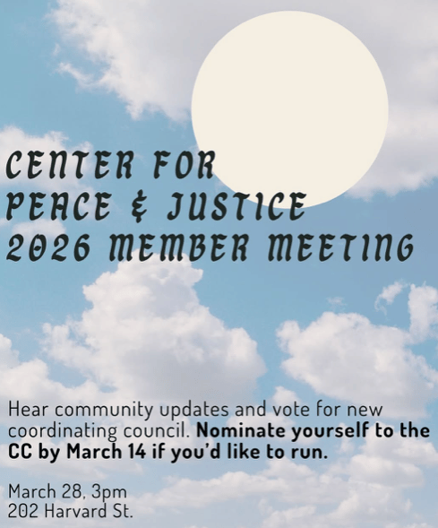 The ACP&J annual Membership Meeting will take place on March 28. If you are interested in serving on the Coordinating Council (CC), please nominate yourself by sending in a blurb about yourself to council@abqpeaceandjustice.org. We will not accept nominations on the floor, so please send these in by the March 14 deadline. A full statement is attached in this email, and we look forward to seeing members on Saturday, March 28 at 3pm!